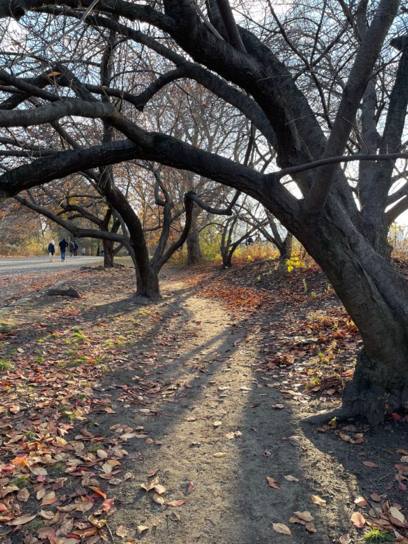 As we were walking through Central Park, we came upon a curious path that made us think that they are not always sparked by the shortest route, but perhaps, the more pleasurable one. It veered only a few feet from the old wide dirt bridal path people like to walk. This new path didn’t short-cut up to the reservoir as we first thought. When we walked it ourselves we realized that it took us into more intimate contact with trees, light, shadow for a pleasurable few steps that gave an inkling of “forest”.